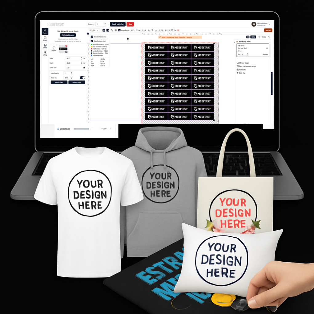 Upload your ready-to-print DTF transfers in multiple gang sheet sizes. High-quality prints, vibrant colors, and fast turnaround. Perfect for T-shirts, hoodies, and more.